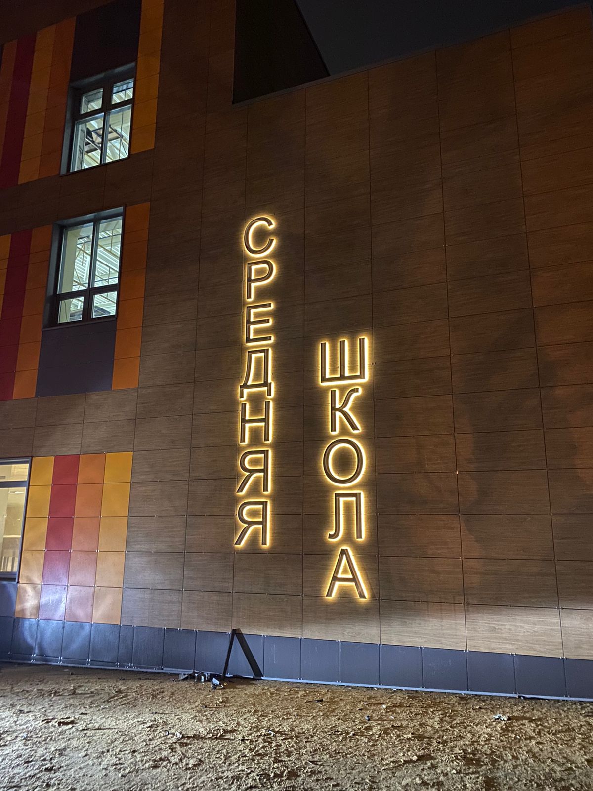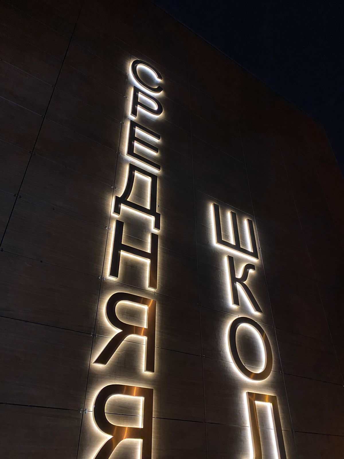 Контражурная подсветка создаёт светящийся ореол вокруг букв. Это делает их особенно заметными в темное время суток. При этом свет равномерно распределяется, не давая резких теней и бликов.