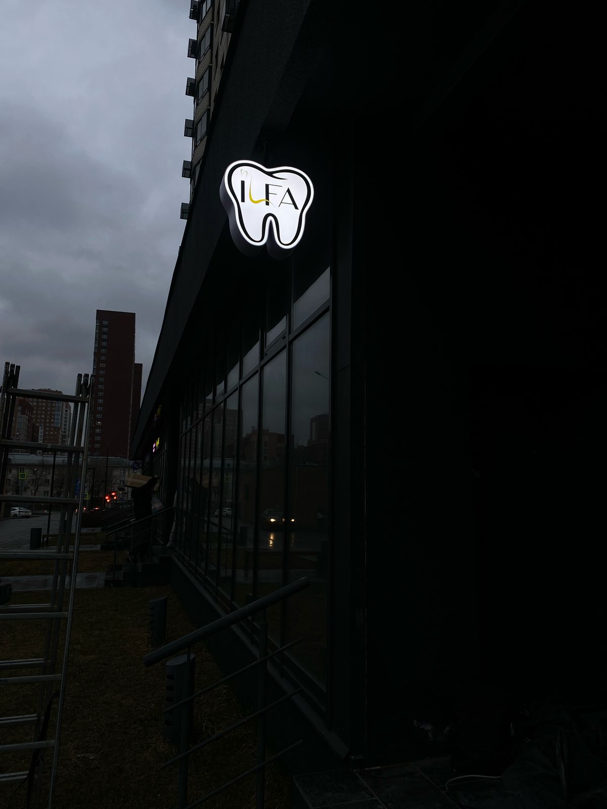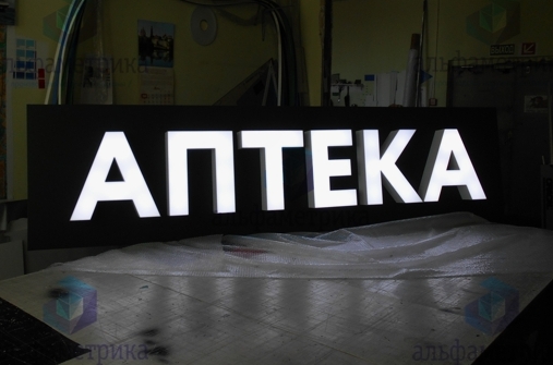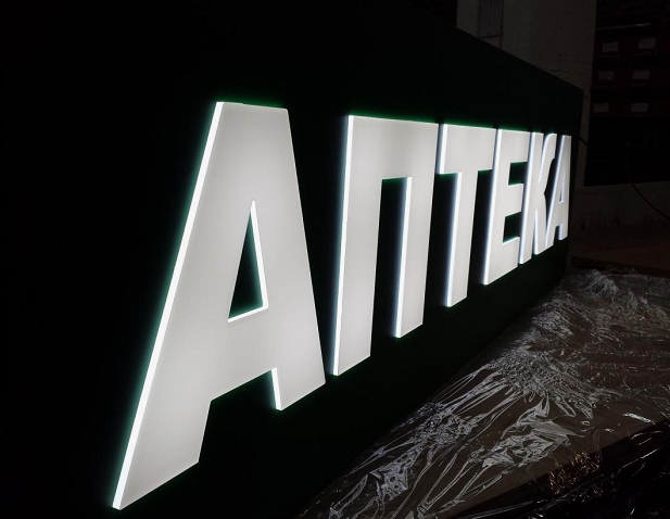 Для лицевой подсветки использовали светодиодную ленту белого цвета 5000 К. Ленту закрепили на внутреннюю часть задней панели короба, а стыки для защиты от влаги залили жидким пластиком Cosmofen. Блок питания с уровней защиты IP67 спрятали в антивандальный короб за вывеской.