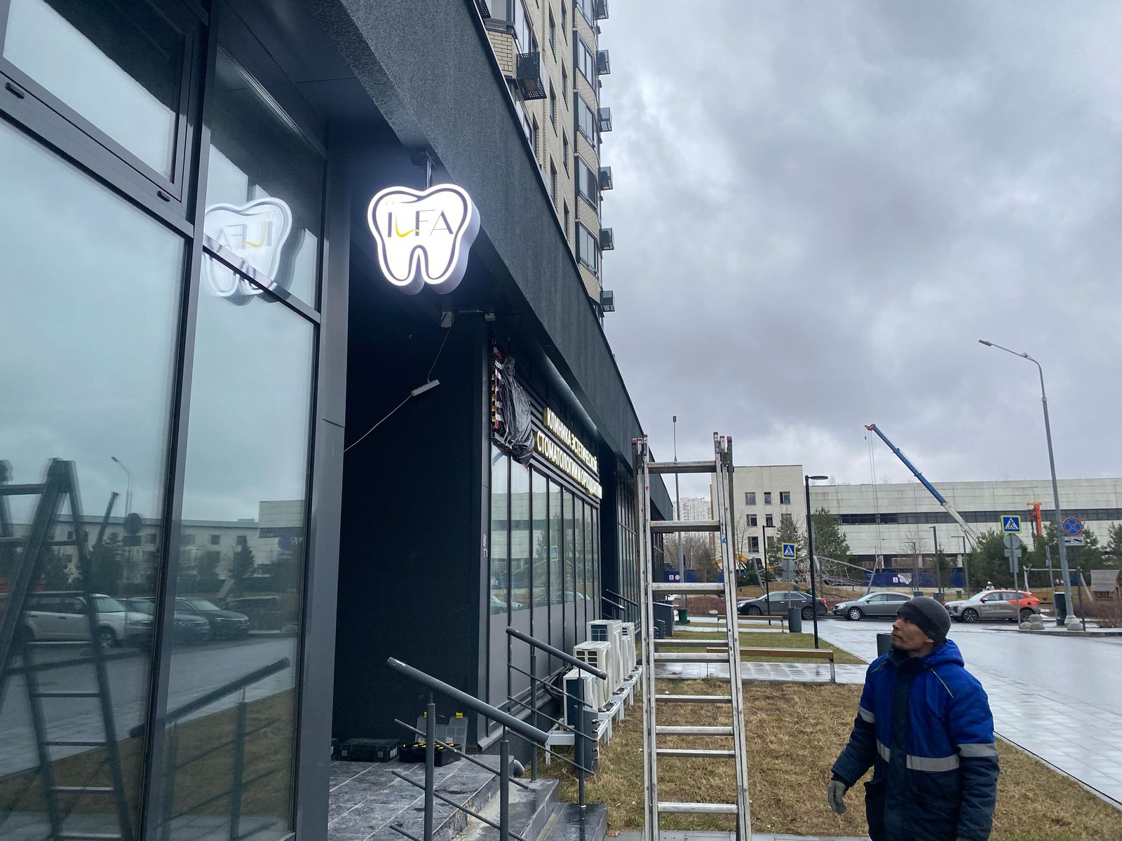 Заказчику нужно было отправить и установить вывеску по адресу: ул. Садовники, 11А, Москва. Вывеска с влагозащитой IP67 установлена на стене. Для разметки отверстий использован лазерный уровень. В просверленные отверстия вставили химические анкеры. Кабели уложили в кабель-канал. Фигурный короб установлен с учётом требований к обслуживанию и очистке фигурного светового короба. Установка вывески произведена на зеркальную подложку. На монтаж ушло 2 часа.