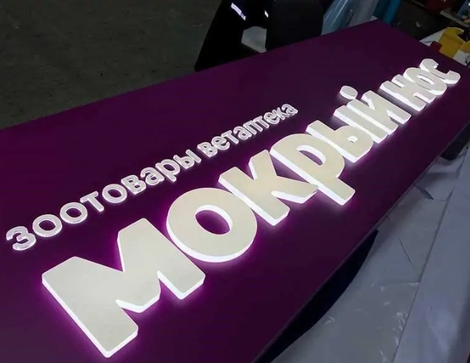 Световой короб с инкрустацией акриловым стеклом — разновидность лайтбокса, в котором свечение исходит только от букв или изображений. Надпись и графика фрезеруются в лицевой панели вывески, а затем заполняются элементами, вырезанными из акрила. Для подсветки этих элементов внутри корпуса вывески устанавливаются светодиодные модули.